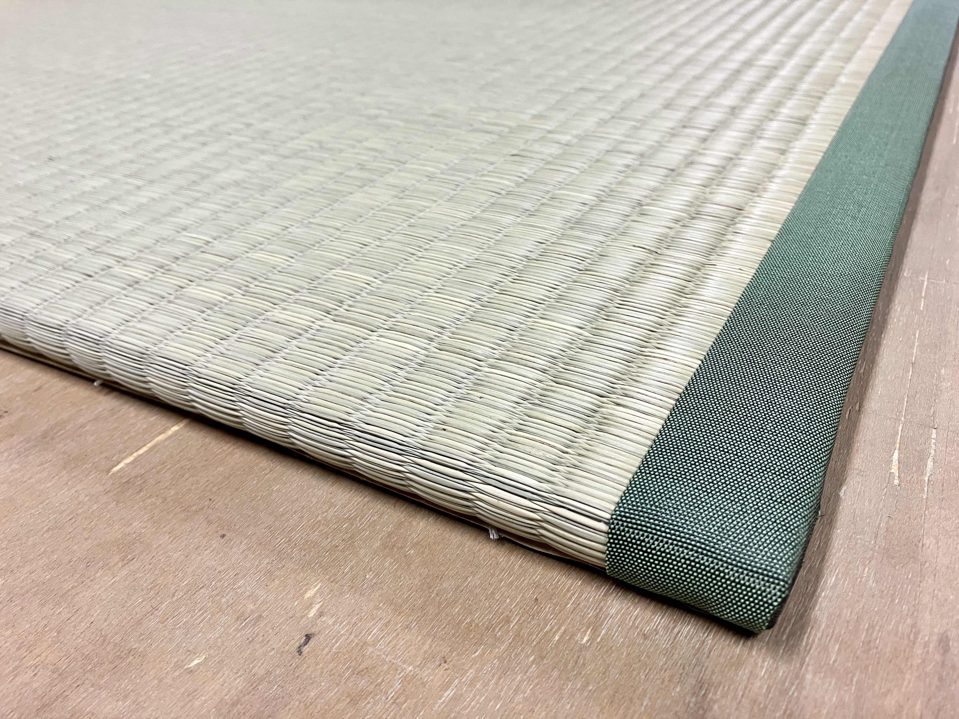 詳しくは聞いてませんが…8畳の和室にフローリングが貼られているので、そこに新しく15ミリの薄畳を敷き込みます。熊本産JASⅡ表にグリーンの無地縁です。