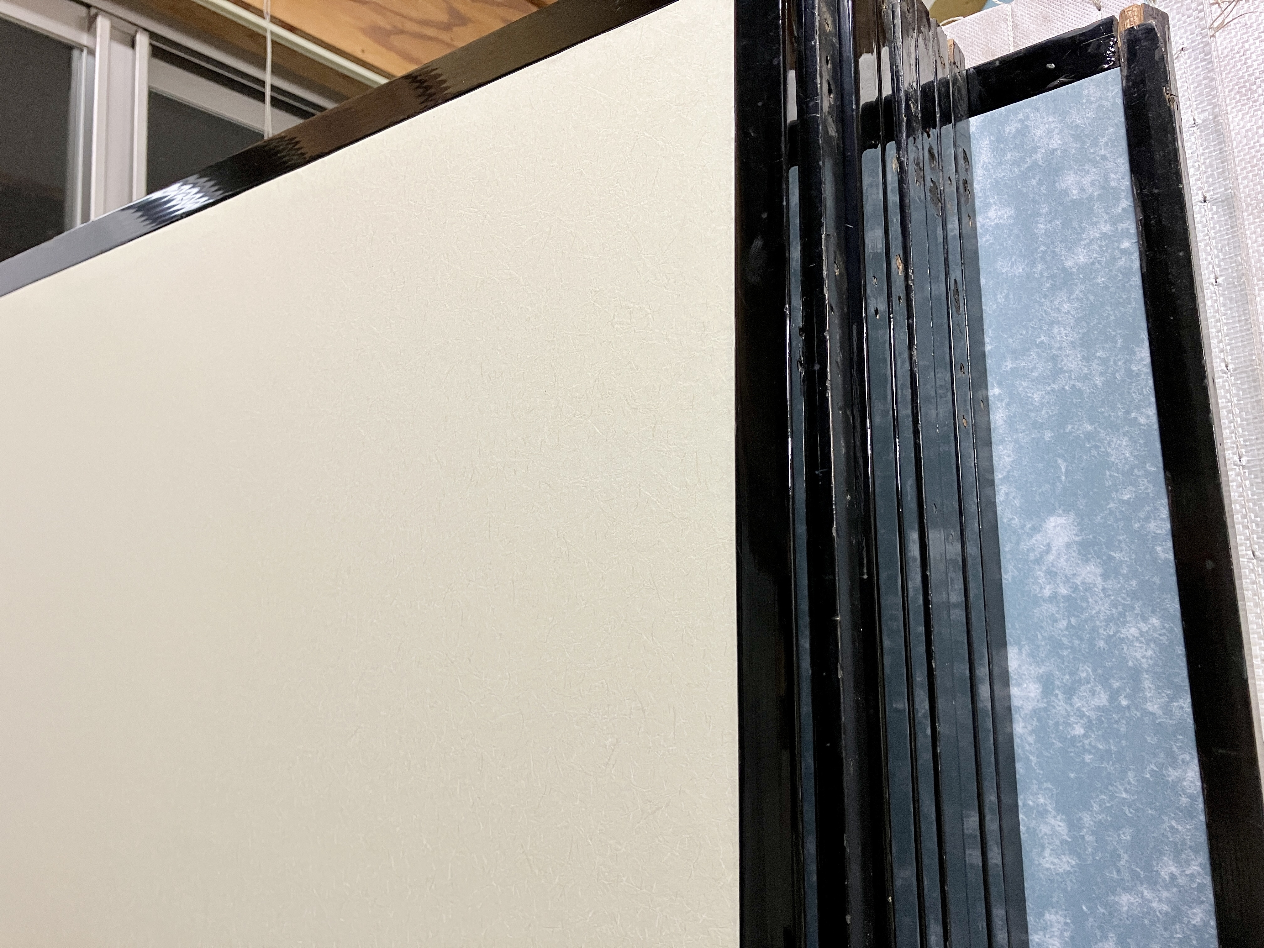 襖の続きです。朝イチでは襖紙が乾いてないので、本襖から外してある黒い縁の補修をしときました。