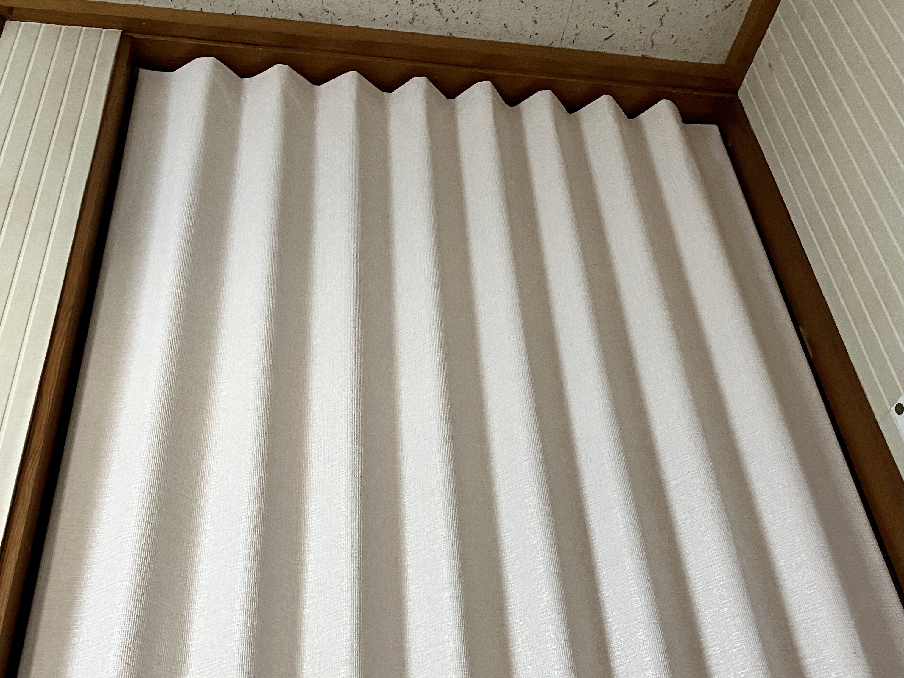 既存のベージュっぽいアコーディオンカーテンを撤去して、明るいアイボリー系に交換です。明るくなりました。
