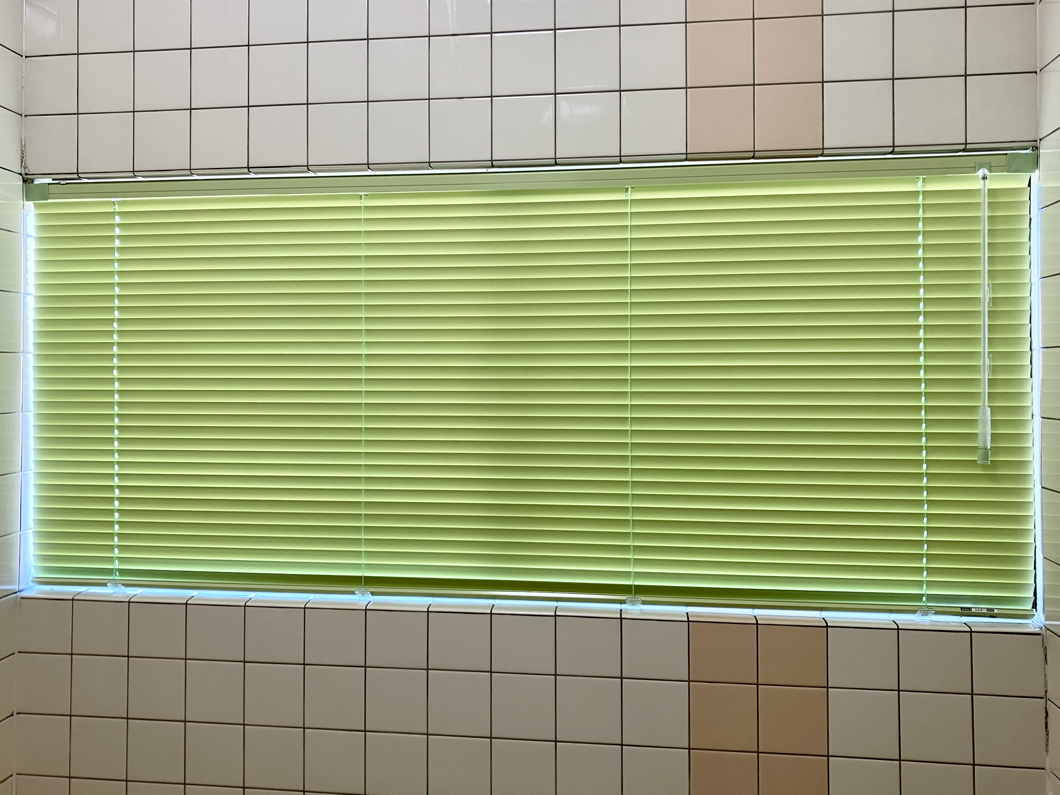 浴室はブラインド交換と掃除を頼まれたので、掃除屋さんに同日施工をお願いしました。ブラインドは浴室用で、爽やかなグリーンを選んでもらいました。羽根部分にフッ素加工が施されているので、お手入れも楽になると思います。