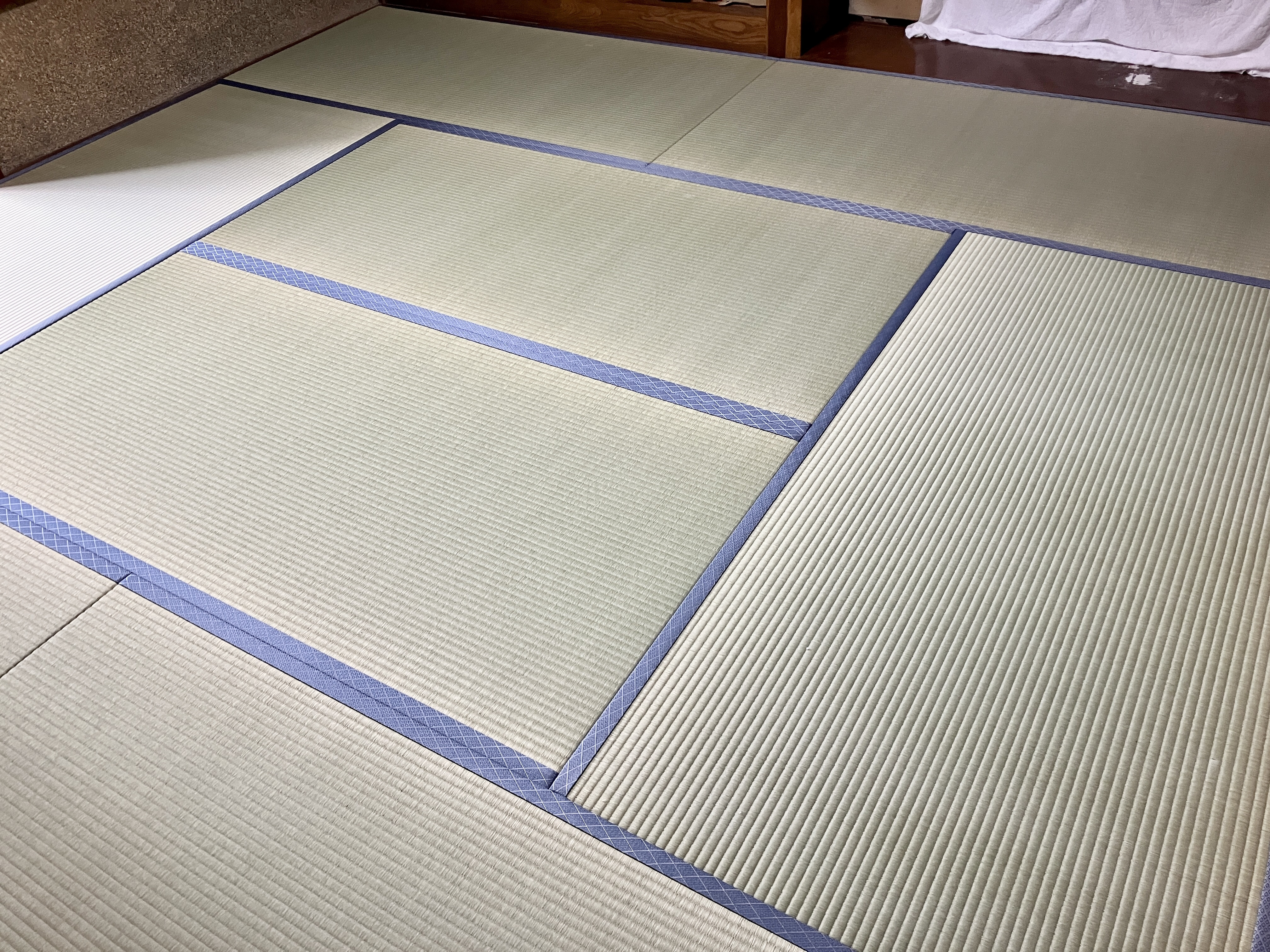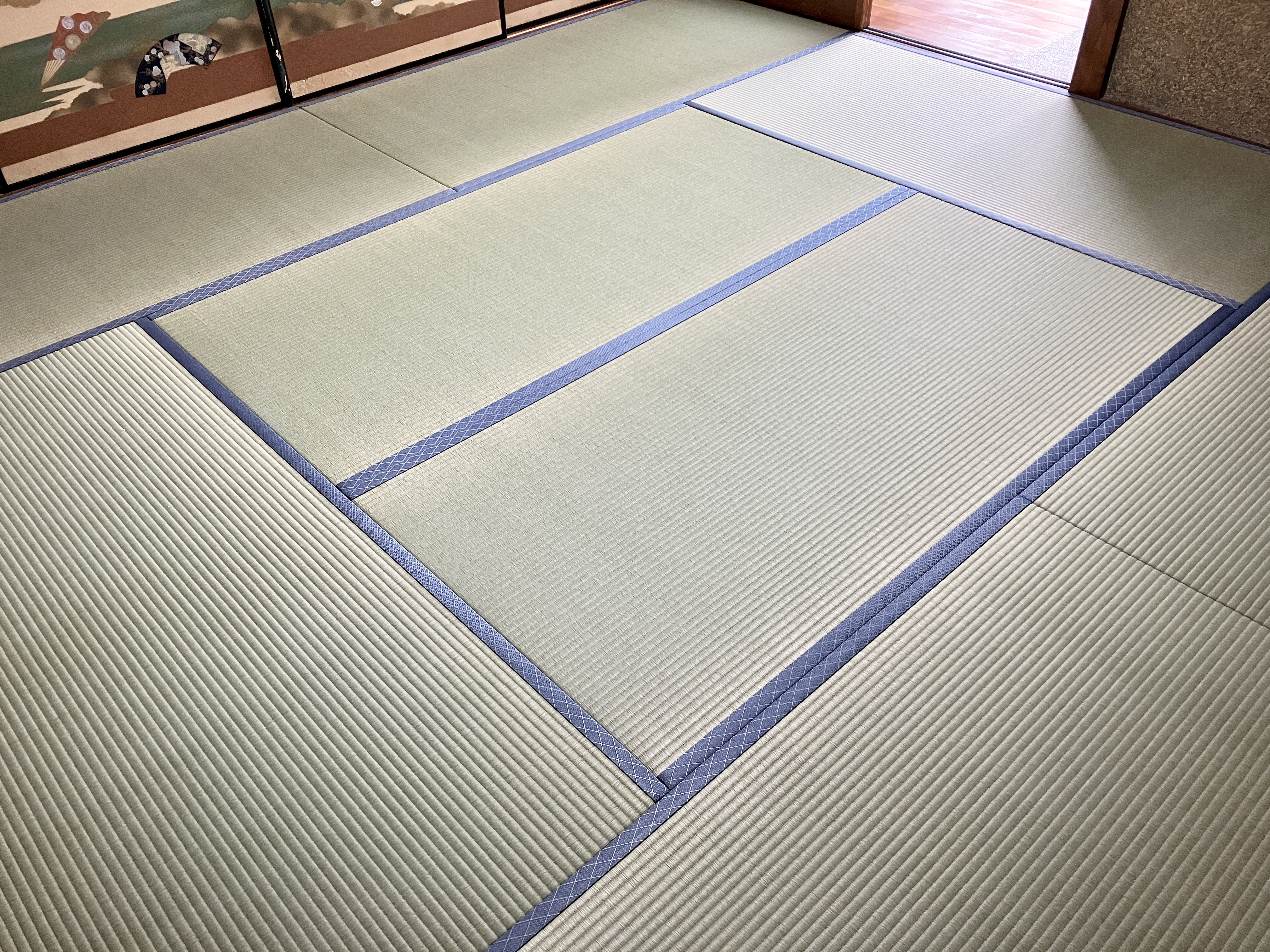 栃木県足利市の現場に、8畳の新畳を納品しました。『熊本産ひのはるか』の畳表が綺麗です。大工さんからの請負い仕事ですが、このくらいの材料が使えるとコチラとしてもやりがいがあります。お客様の前で「くまモンのタグ」を抜いて、「証明書」と一緒にお渡ししました。