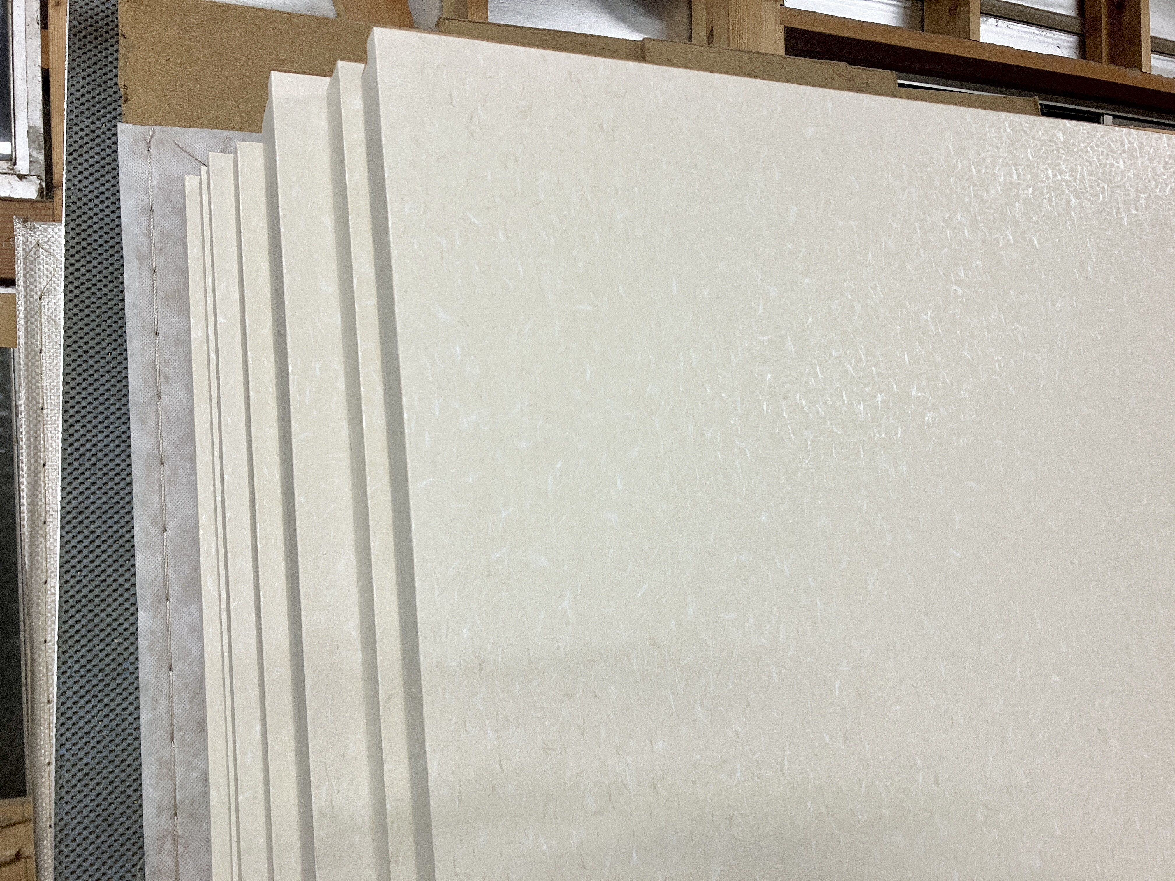 建具は枠の無い太鼓襖になっているので、襖紙を巻き込んで張っていきます。引戸は上下をカットして左右(横)を、開き戸は上下左右の全て巻き込みます。