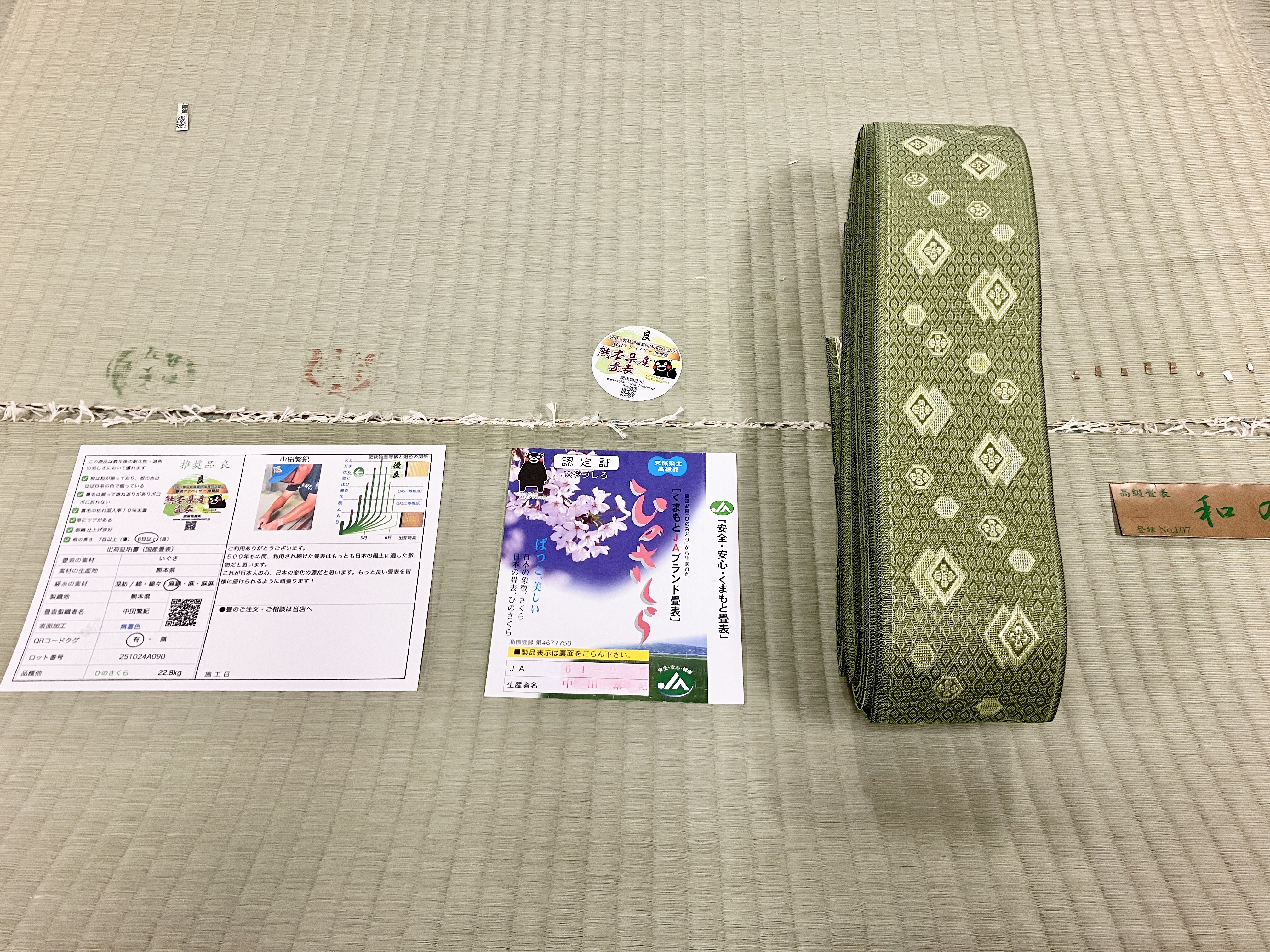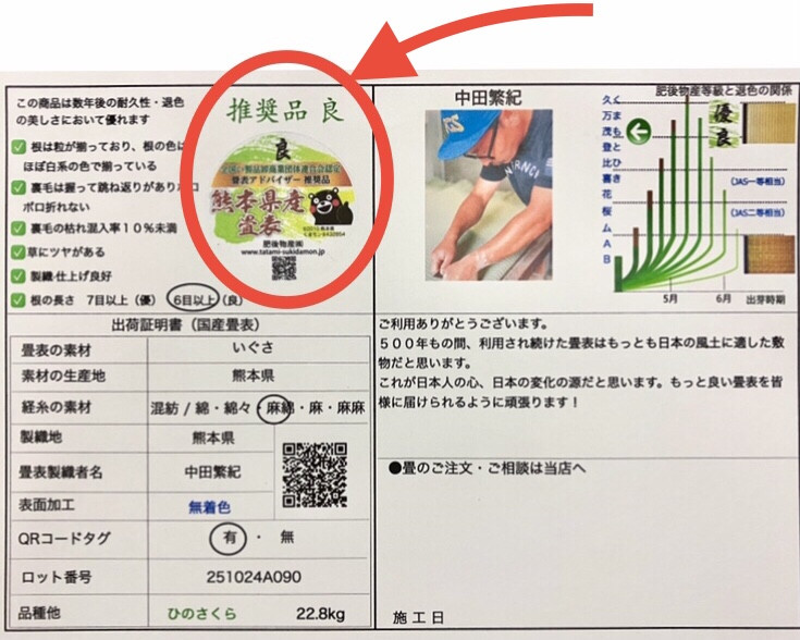 施工後お客様にお渡しする出荷証明書に『推奨品 優』『推奨品 良』がある畳表は、数年後の耐久性・退色の美しさに優れています。今回、使用させていただいた畳表の出荷証明書です。