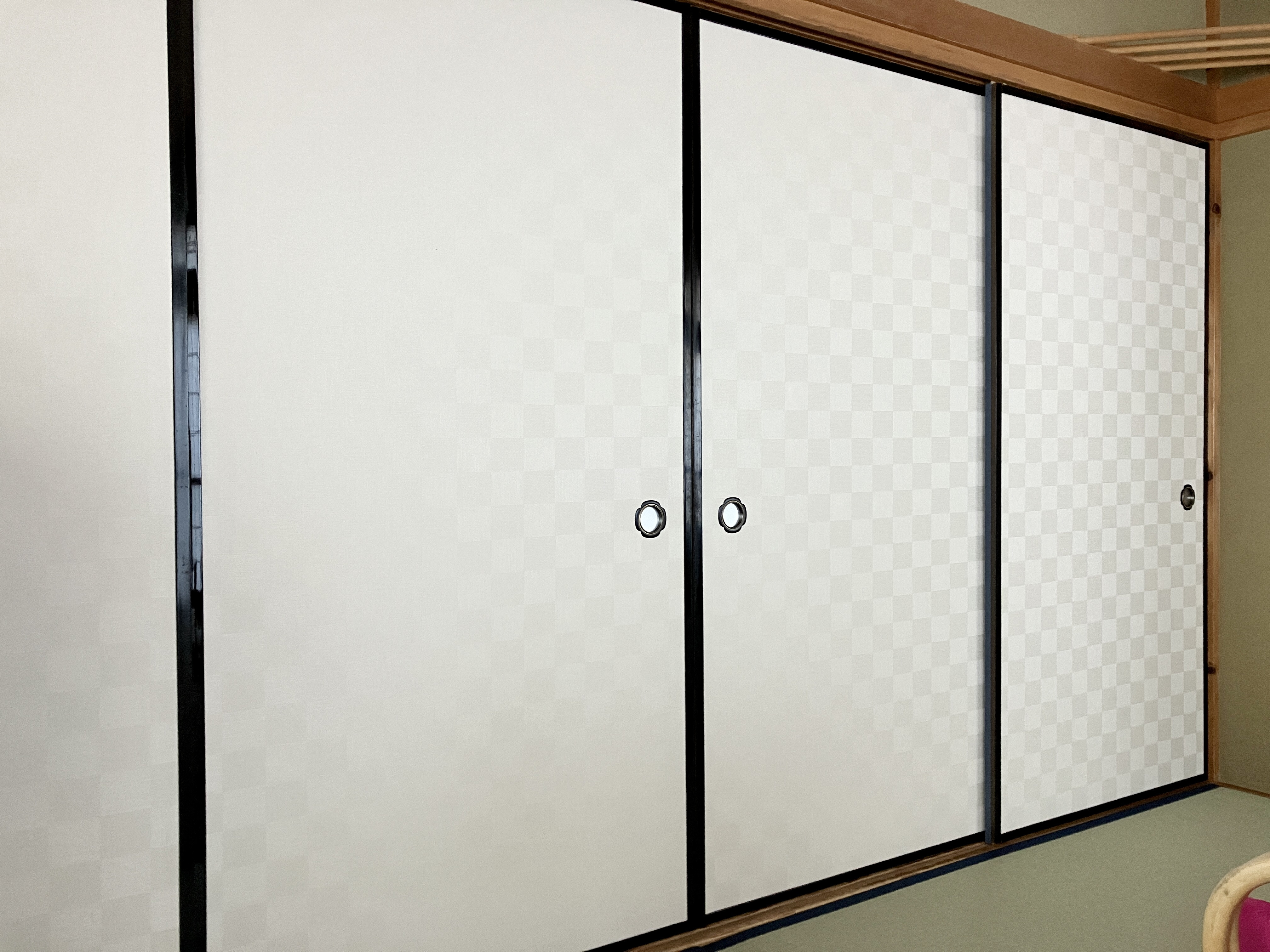 こちらのお客様宅から、引き続き中仕切り(両面)の襖を4本引き上げです。襖柄は、同じ物を使います。持ち帰って、既存の襖紙を剥がしました。