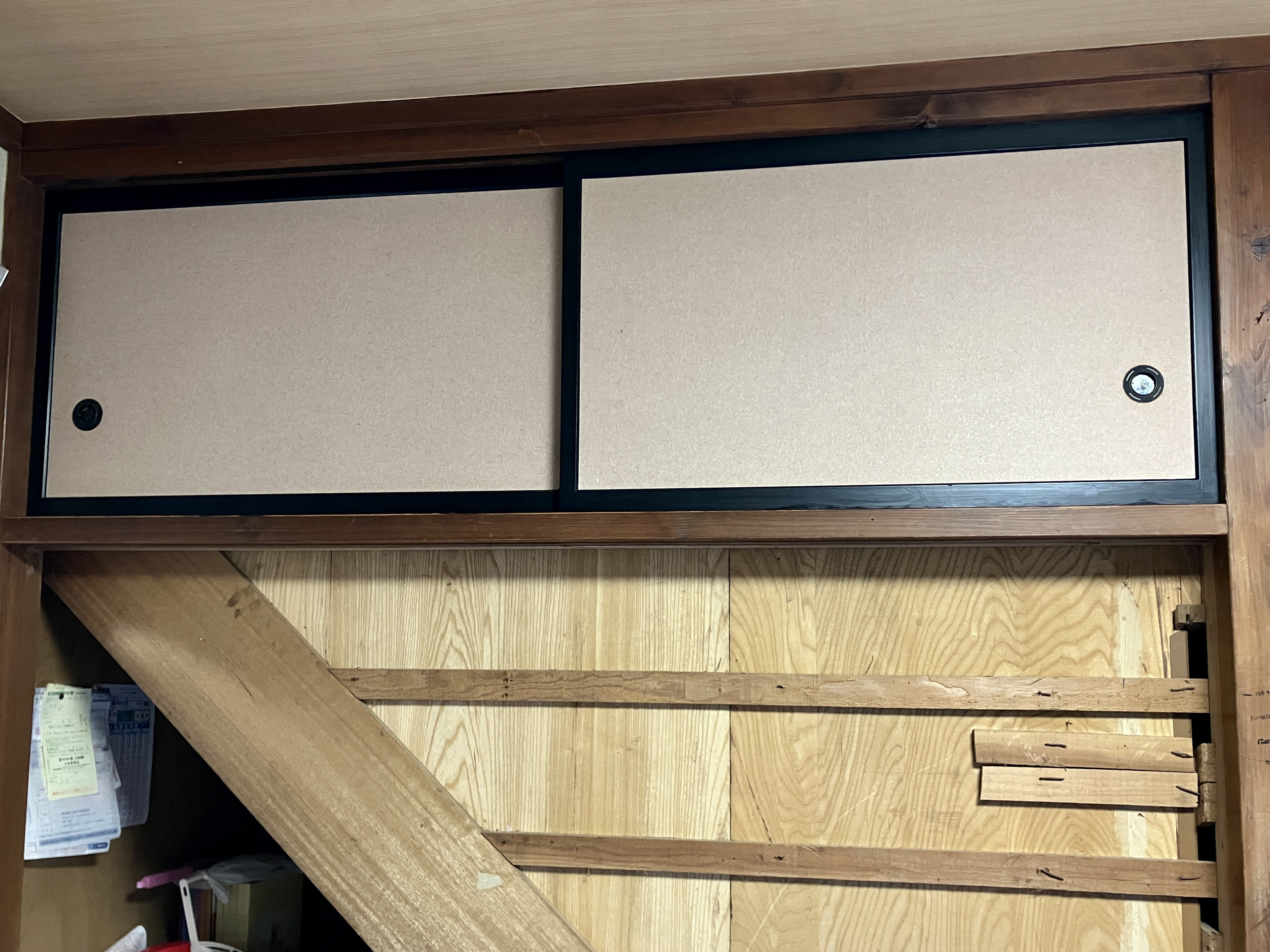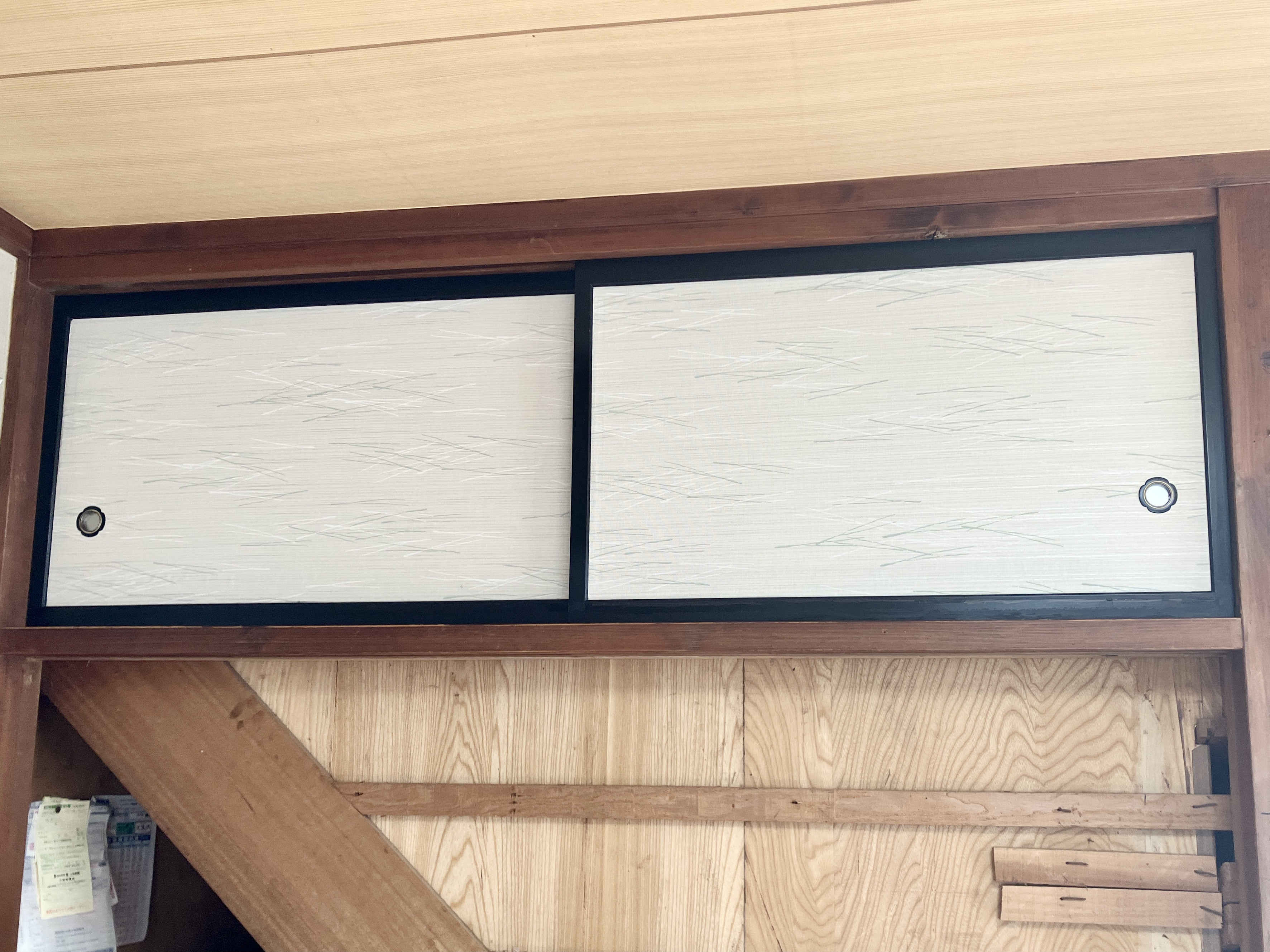 そして、外れない天袋の襖を現場で張替えです。以前2階を増築した時に、天袋の部分は押し入れとして使えないので裏から固定してあるようです。