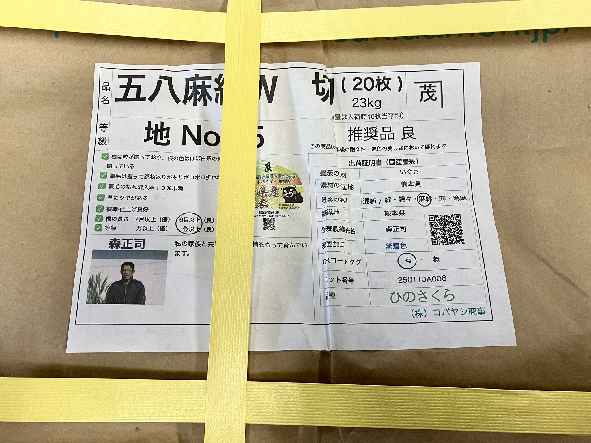 桐生市相生町のお客様に使用する『くまもとJAブランド畳表ひのさらさ』12畳分入荷しました。畳表生産者の中でも、レジェンド的存在の早川猛氏の畳表です。「最高級ランク×レジェンド」ですので、日本一の畳表と言っても過言ではありません。惚れ惚れするほど、素晴らしい畳表です。