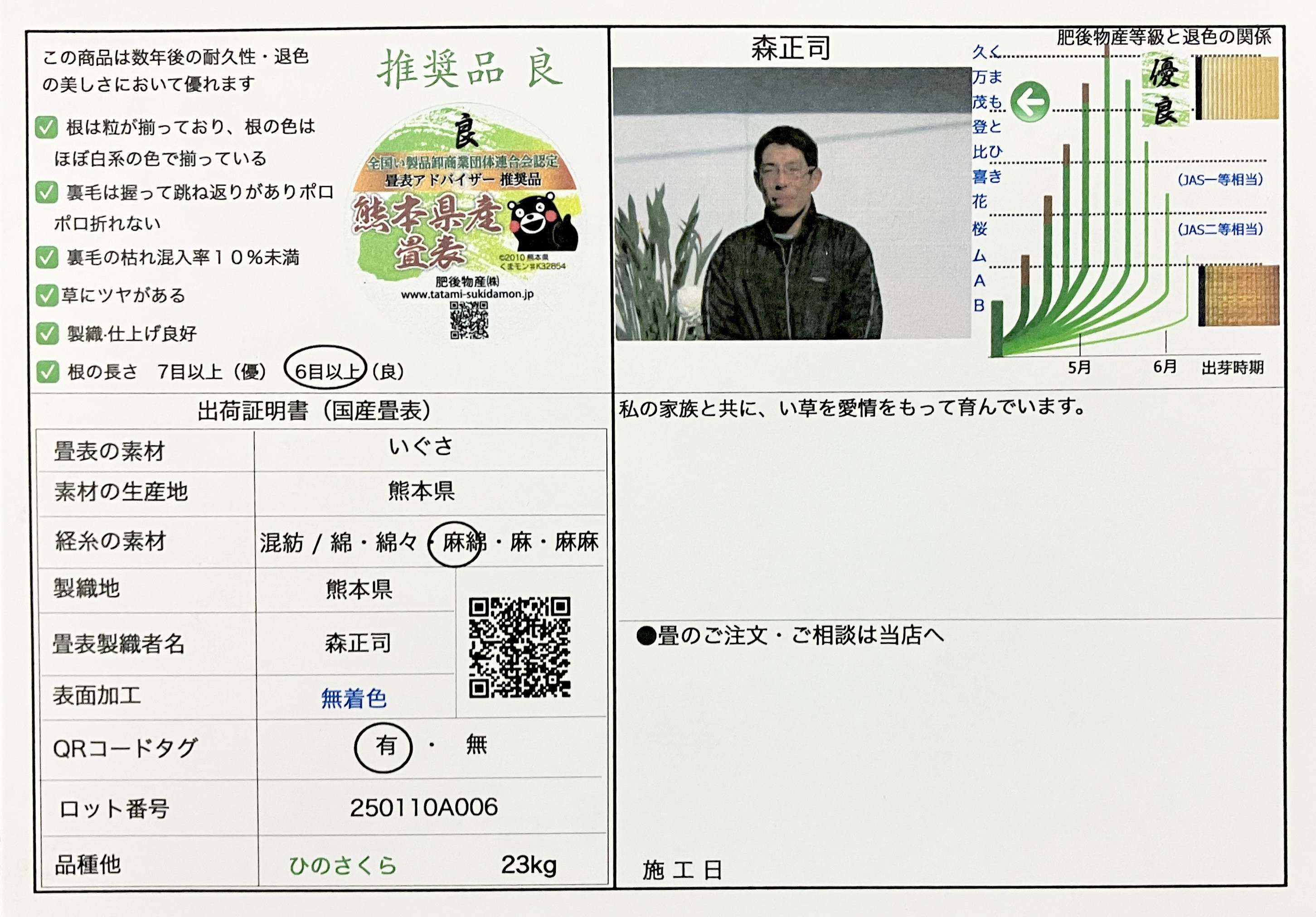 思ったとおり、熊本県産の『ひのさくら』という推奨品の畳を紹介していただき、良心的なお値段で購入できました。