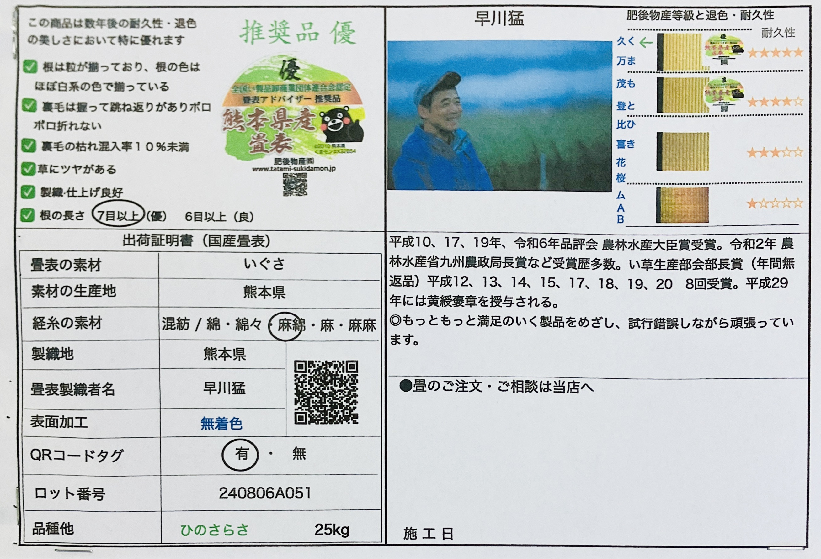 納品時にお渡しする「品質証明書」には、その畳表のランクや産地がはっきりと記されています。
