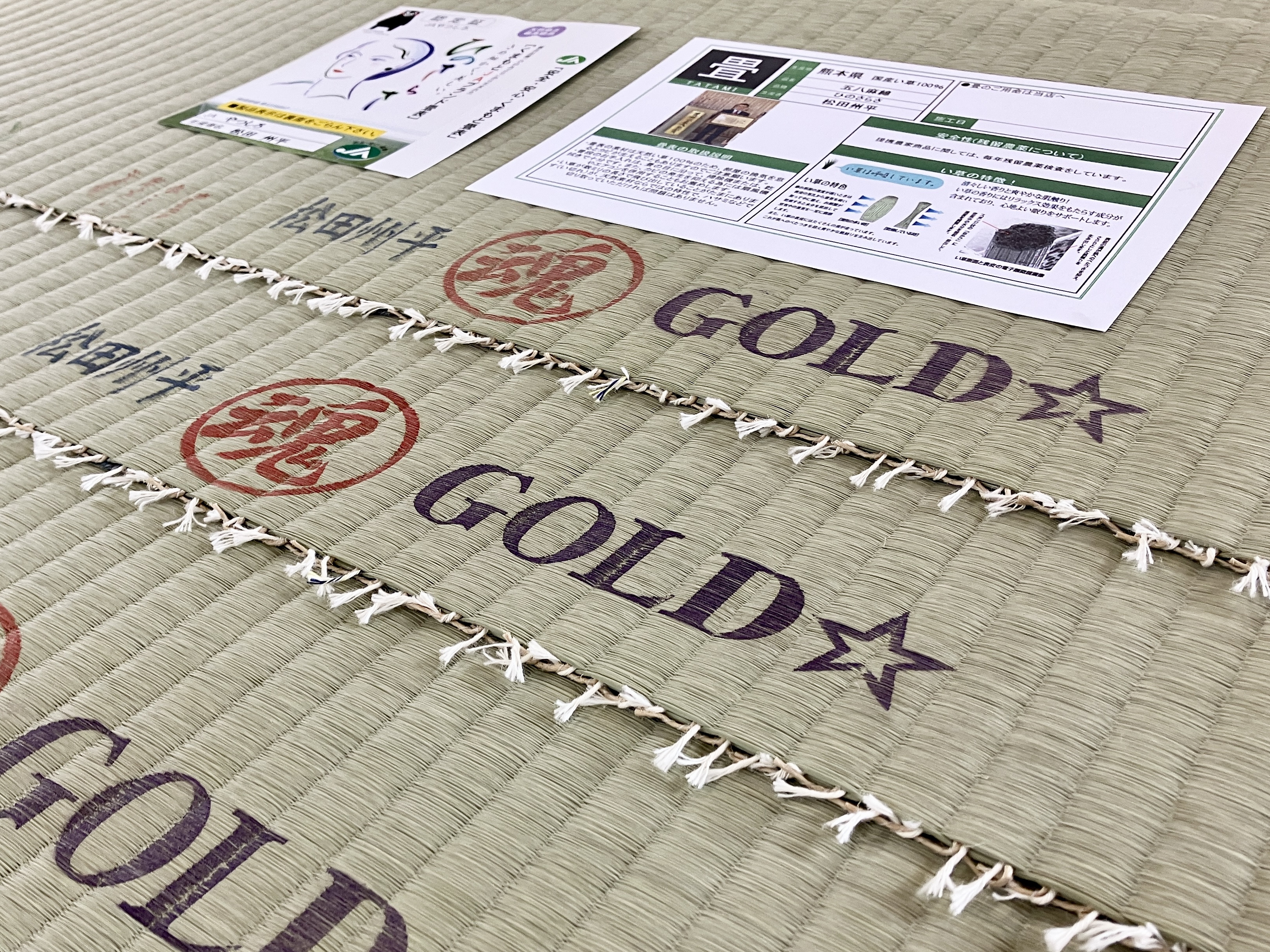 畳表には、氏の情熱の証である「赤い魂ハンコ」が鮮やかに刻印されています。