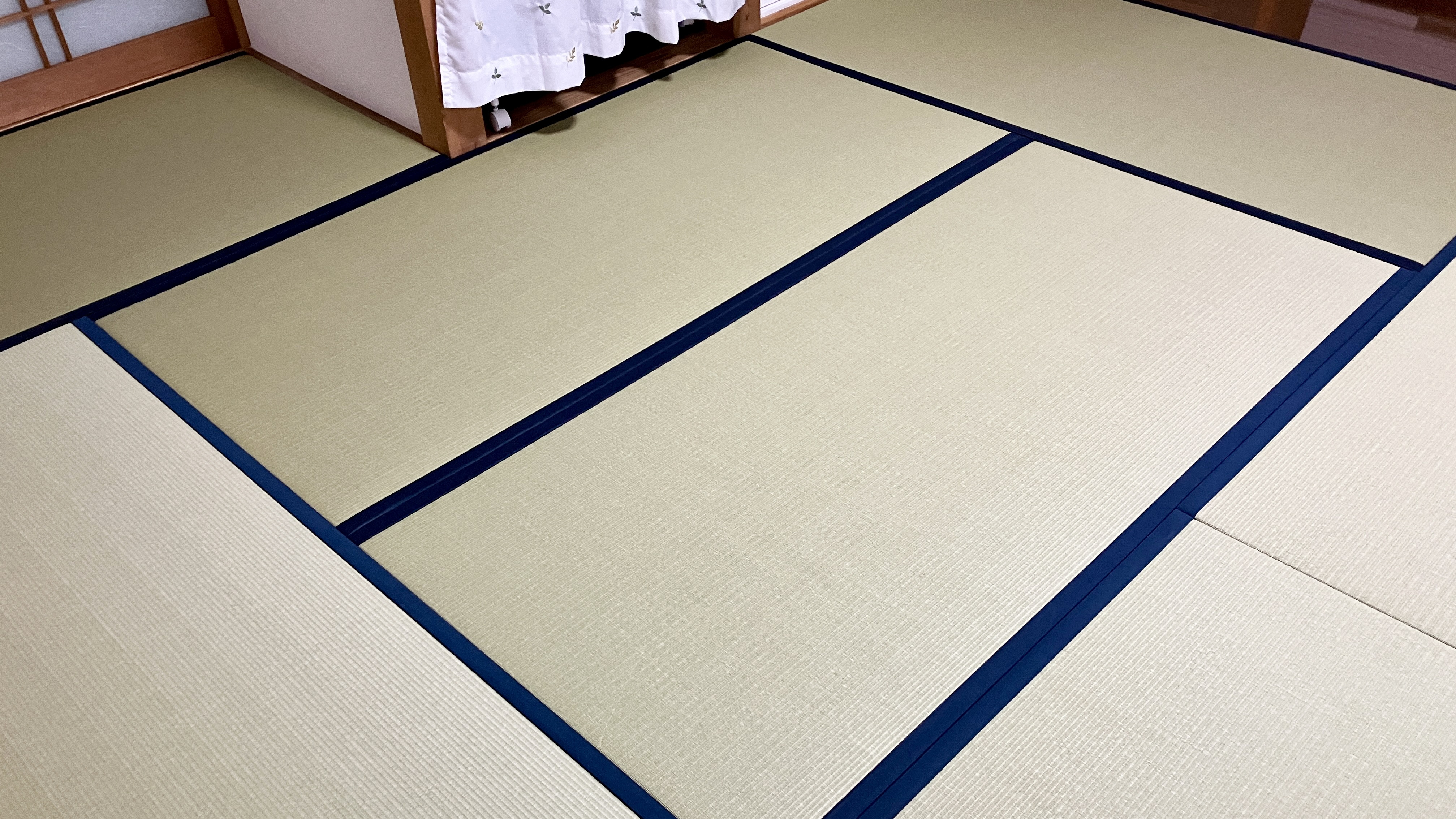 畳縁には「綿ポリNo.8」の紺無地をお選びいただきました。7畳と7.5畳のお部屋を、1日1部屋ずつ心を込めて丁寧に仕上げさせていただきました。紺色の縁が、和紙表の清涼感を引き立てます。