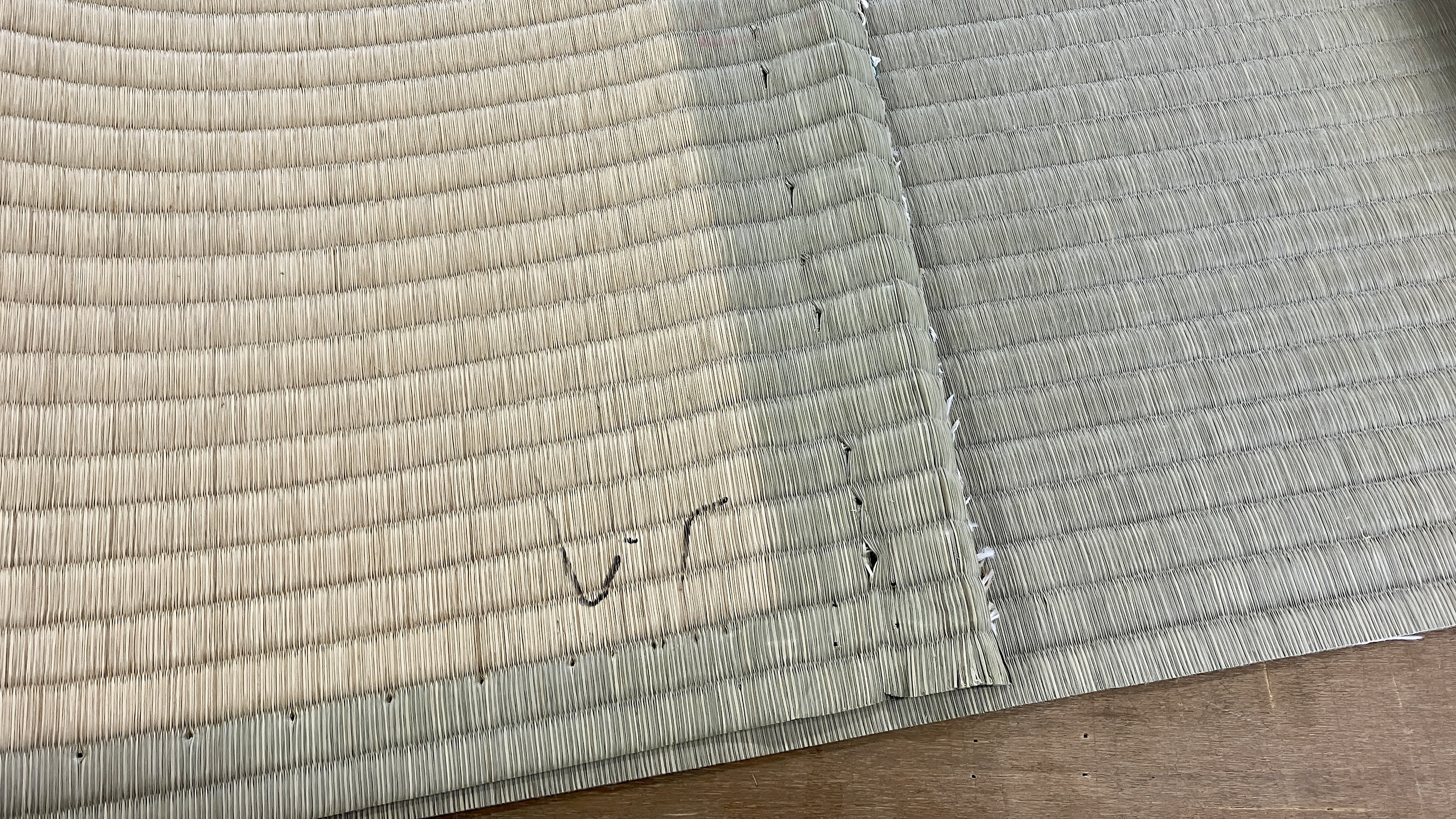 打ち合わせでお話ししていた通り、この証明書を大切に保管してくださっていた菱町のお客様。その想いに応えるように、引き上げてきた畳表は、5年経っても驚くほど美しい状態でした。