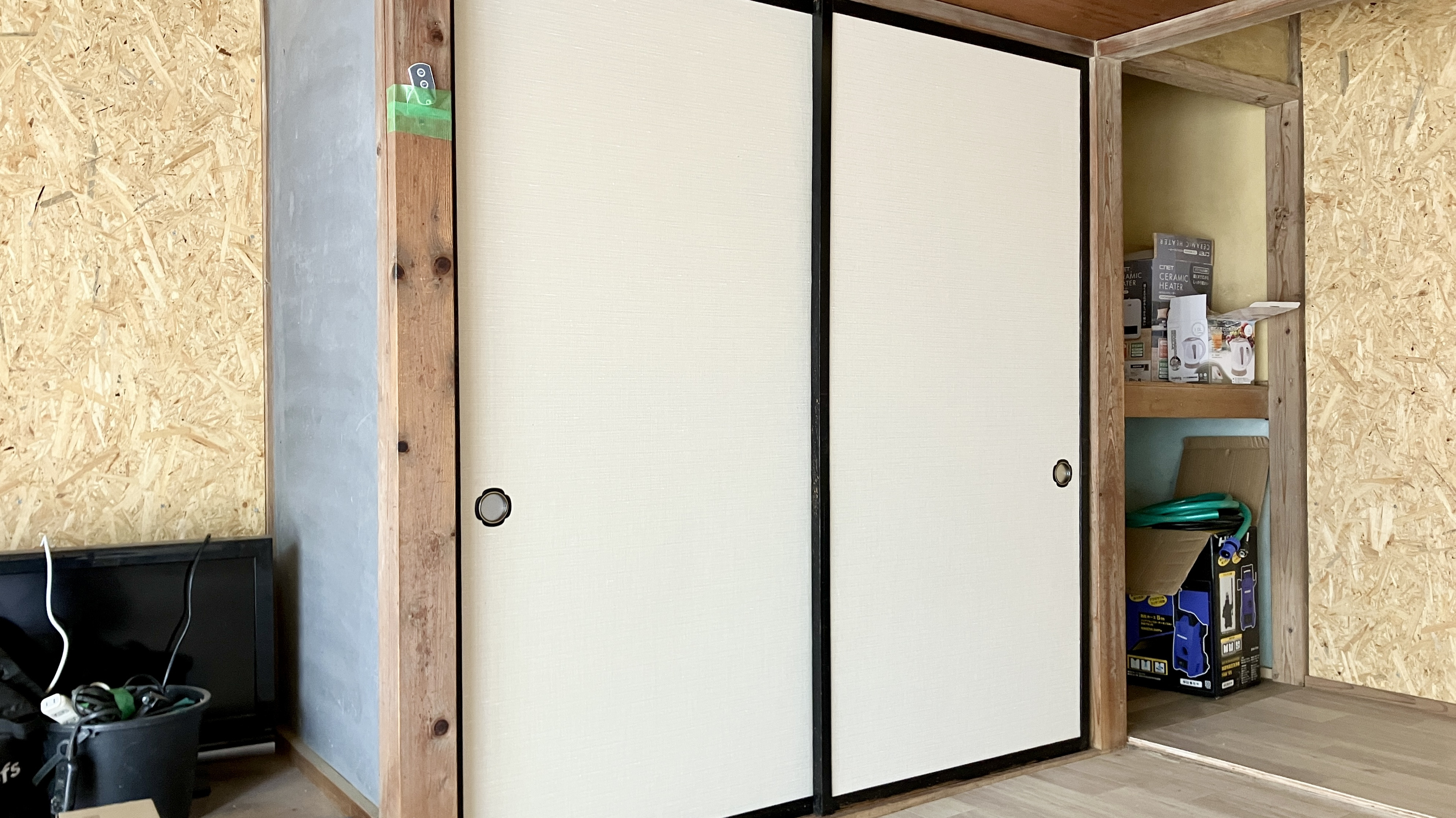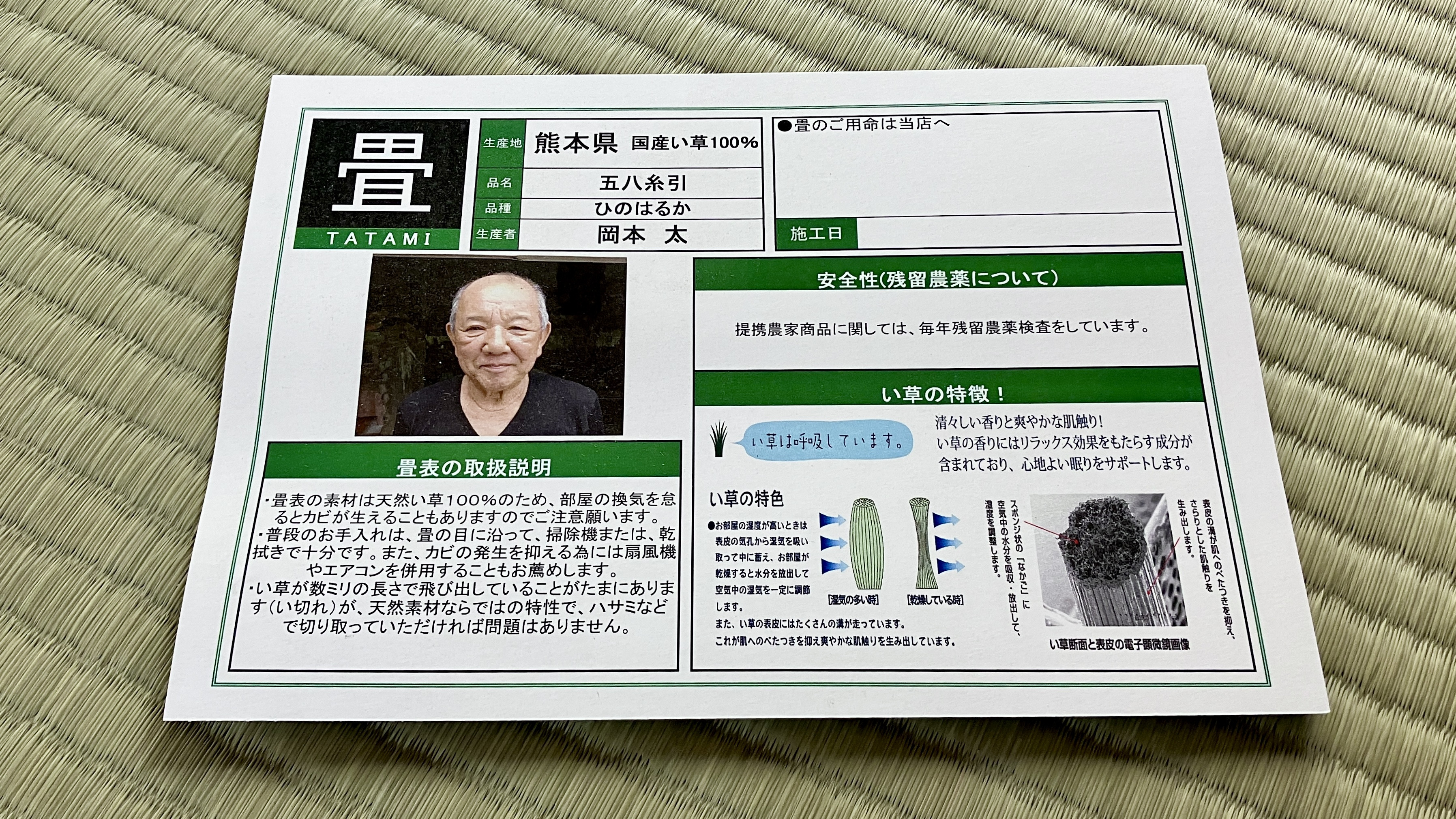 今回の現場で最も神経を使ったのは、新調する2畳の「床(とこ)」選びでした。既存の2.5畳は、今では貴重な藁床(わらどこ)。ここに安価な建材床の新畳を混ぜてしまうと、歩いた時の沈み込みや硬さが変わり、入居者様が違和感を覚えてしまいます。そこで今回はあえて「藁サンド床」を採用し、既存の畳と踏み心地を揃えました。