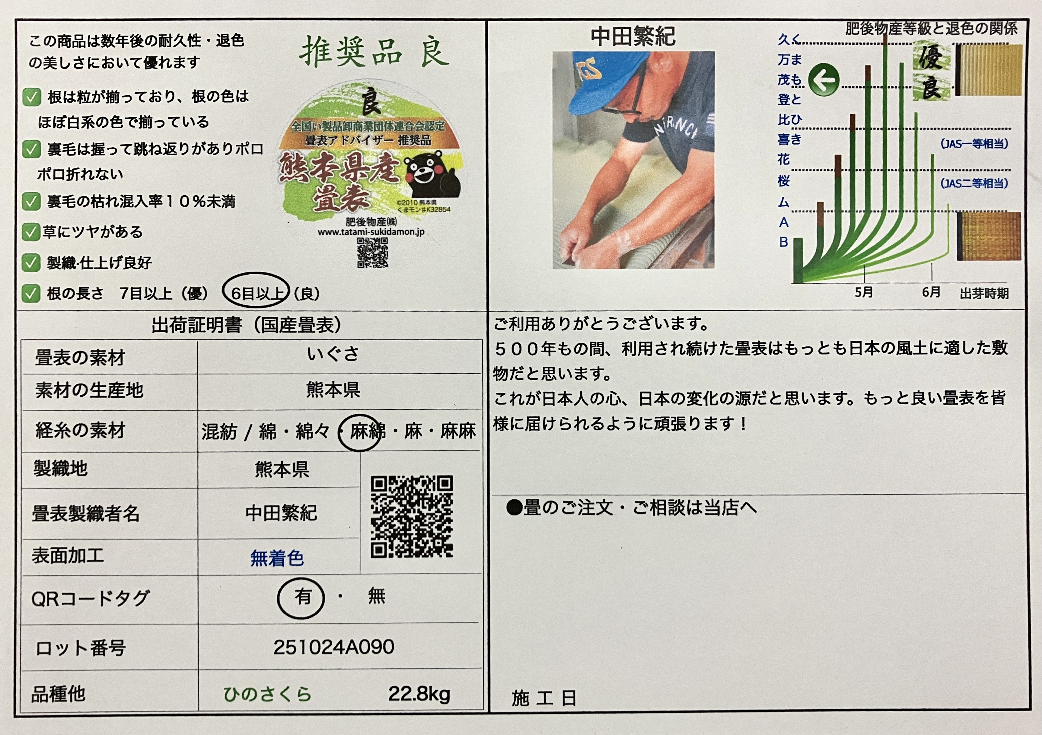 お客様の安心・安全を第一に、品質重視で厳選した国産畳表のみの取り扱いになります。畳表は「イ草の長さ」「織り込み密度」「実の充実」で価格が変わります。