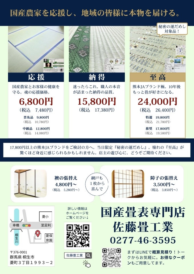 群馬県桐生市の佐藤畳工業、佐藤です。明日3月27日(金)の新聞朝刊に、当店の最新チラシが折り込まれます!